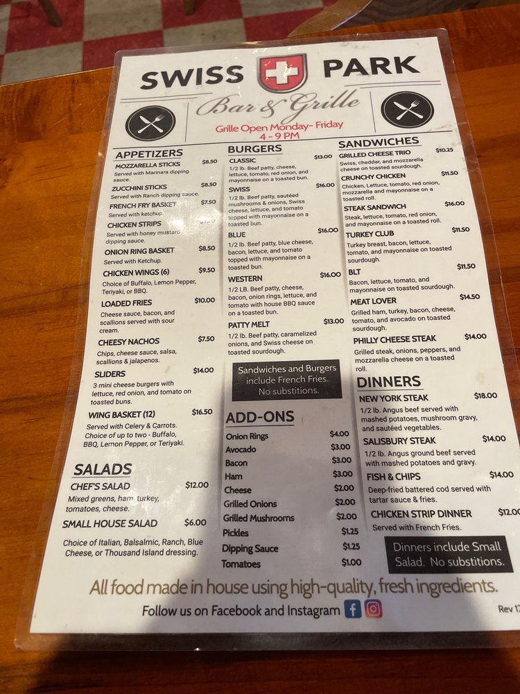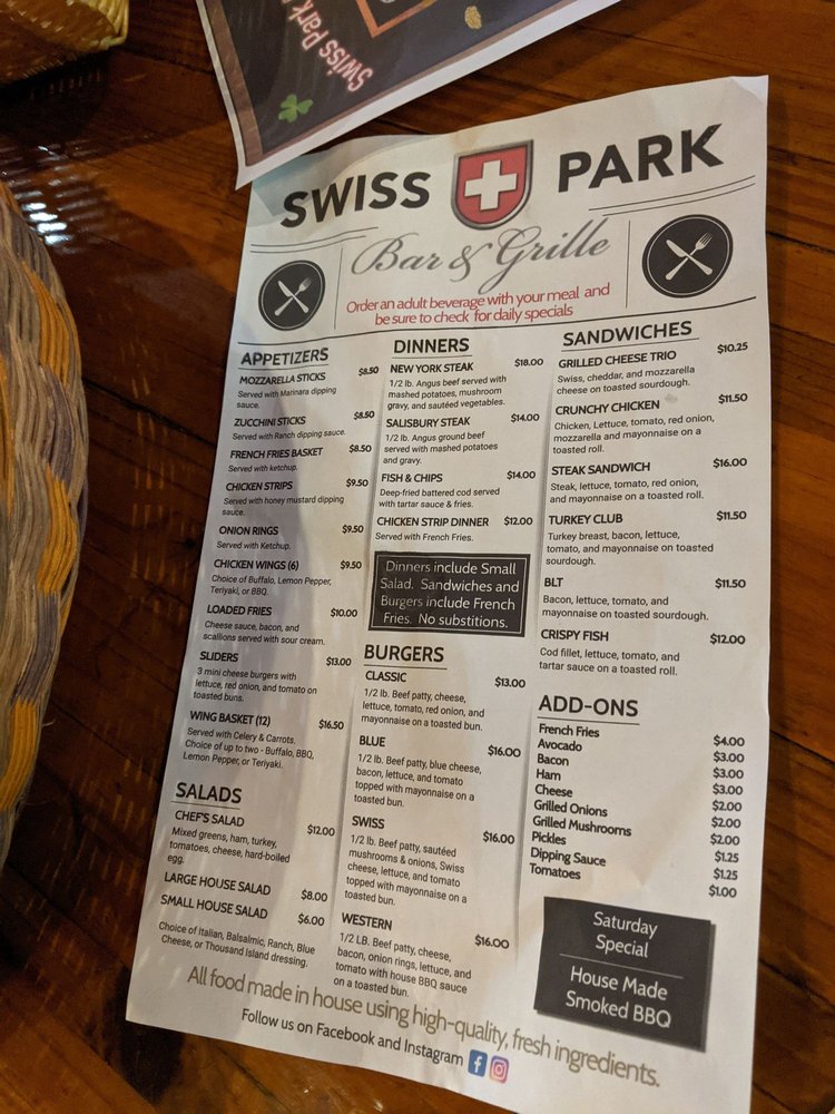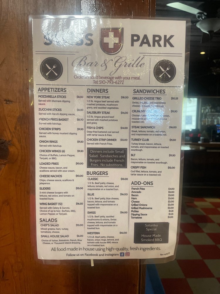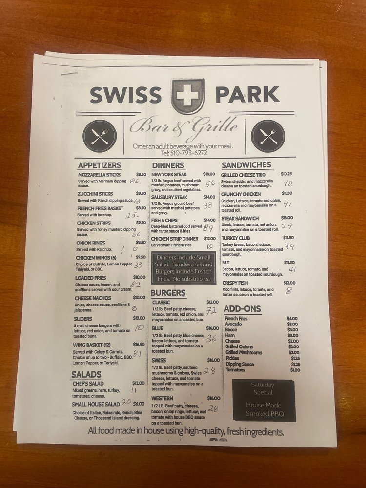 Swiss Park Bar & Grille in Newark, CA offers a variety of American dishes with a casual atmosphere and a full bar. The menu features appetizers like garlic fries, chicken wings, and mozzarella sticks, as well as dinner options including New York Steak and Salmon. Customers praise the Sunday Football BBQ specials, Wednesday Prime Rib deals, and the great service provided. The space is wheelchair accessible, offers outdoor seating, and is perfect for hosting events. The food is well-prepared, with options for vegetarians and those with dietary restrictions. Overall, Swiss Park Bar & Grille is a great spot for a delicious meal with friends and family in a welcoming setting.